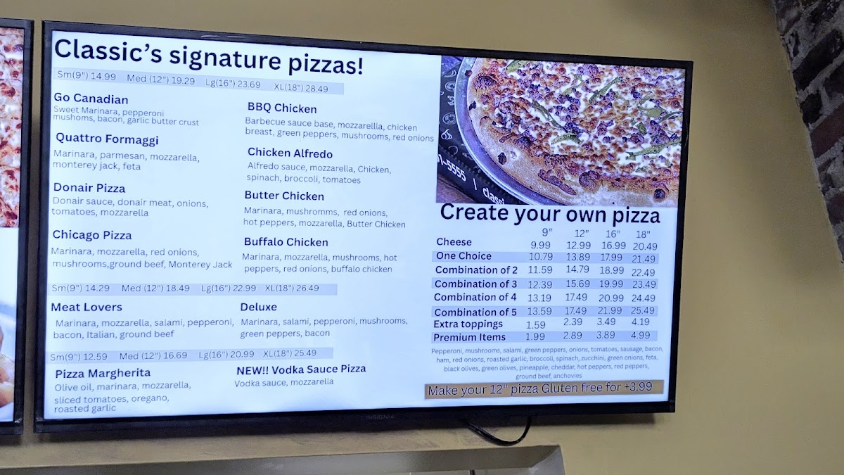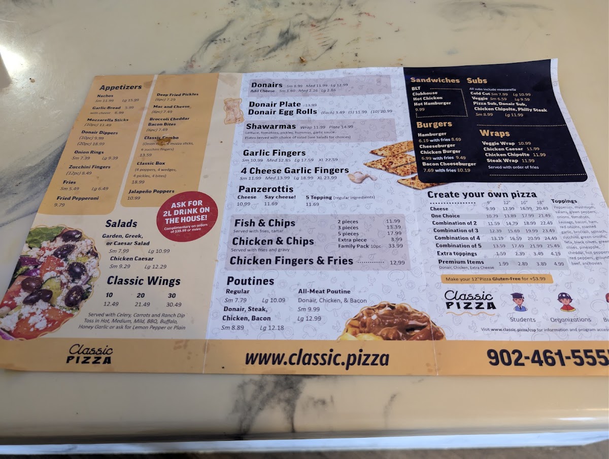 The menu at Classic Pizza offers a wide variety of delicious options, making it a go-to spot for anyone craving comfort food. The BigDeal Special® includes a range of combo deals such as Big Deal #1, Big Deal #2, and Big Deal #3, perfect for sharing. For pizza lovers, there are unique choices like the Classic Pepperoni (new!), Go Canadian, Donair Pizza, and the Pesto Pizza. You can also create your own pizza in small, medium, large, or extra-large sizes.